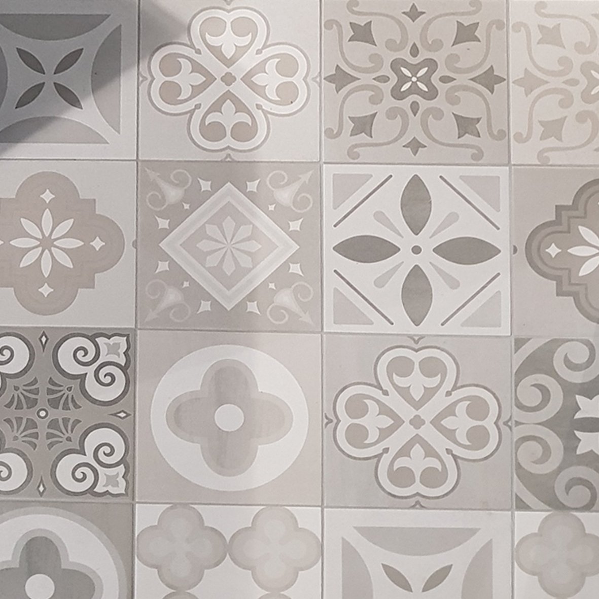 De Flaminia Retro Mix 20,3×20,3cm is een imitatie Portugese cementtegel, maar dan met de voordelen van een gebakken tegel. Deze mix bestaat uit een decorset van 13 verschillende uitvoeringen onderling afwisselend in lichte en donkere grijstinten